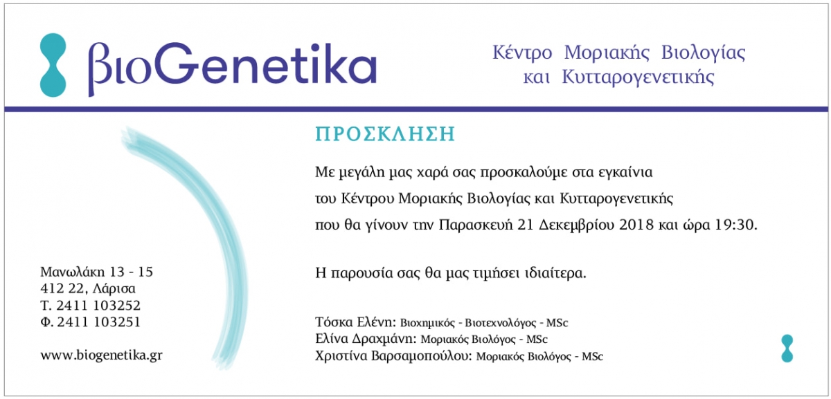 Οι υπεύθυνοι του κέντρου Μοριακής Βιολογίας και Κυτταρογενετικής βιοGenetika σας προσκαλούμε στα εγκαίνια του εργαστηρίου μας. Η παρουσία σας θα μας τιμήσει ιδιαίτερα.